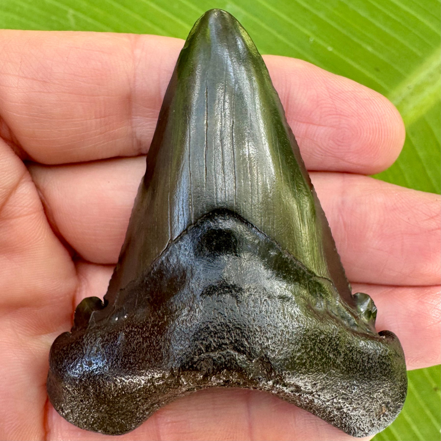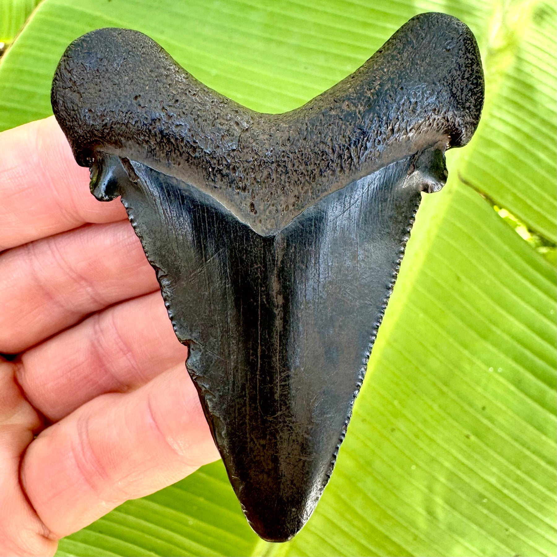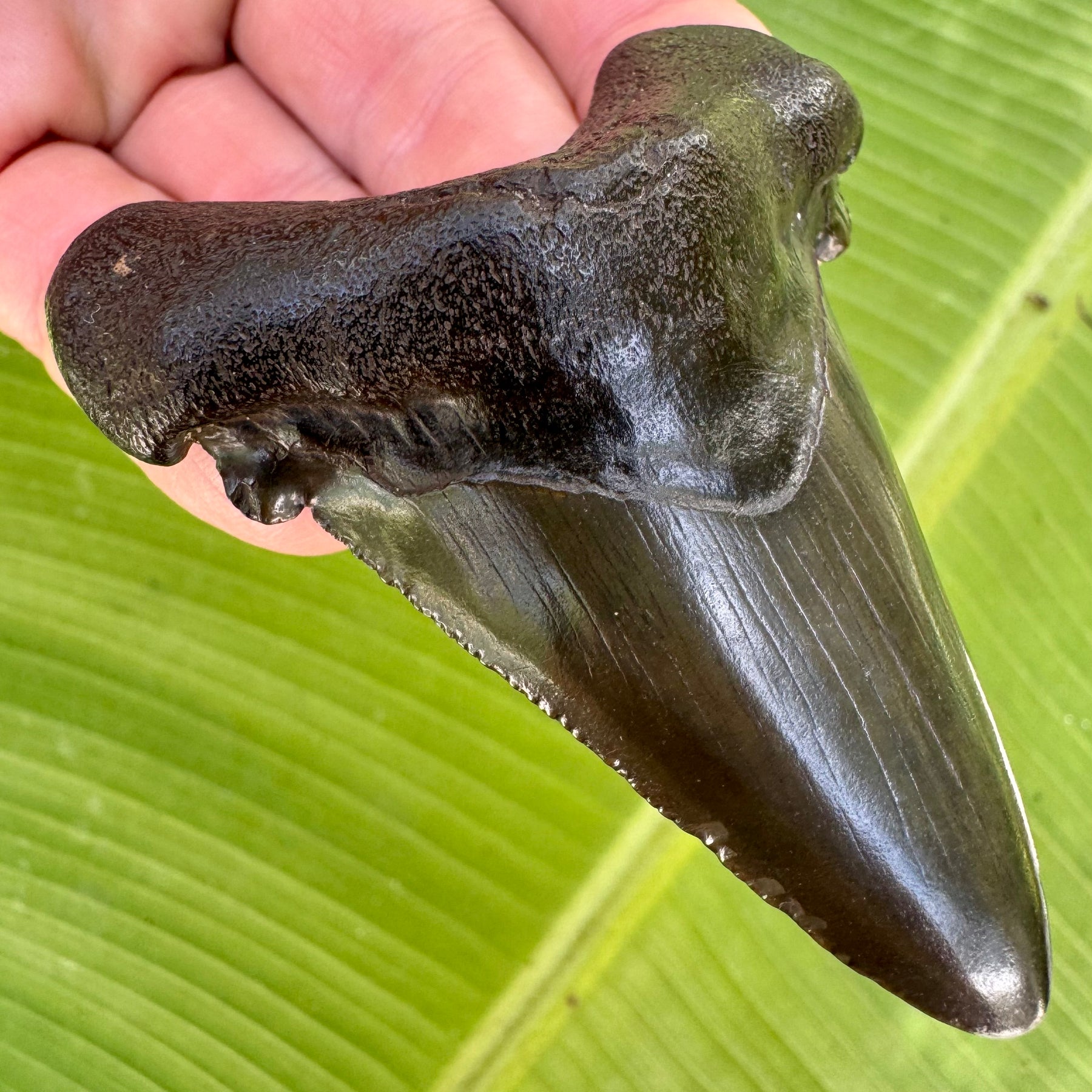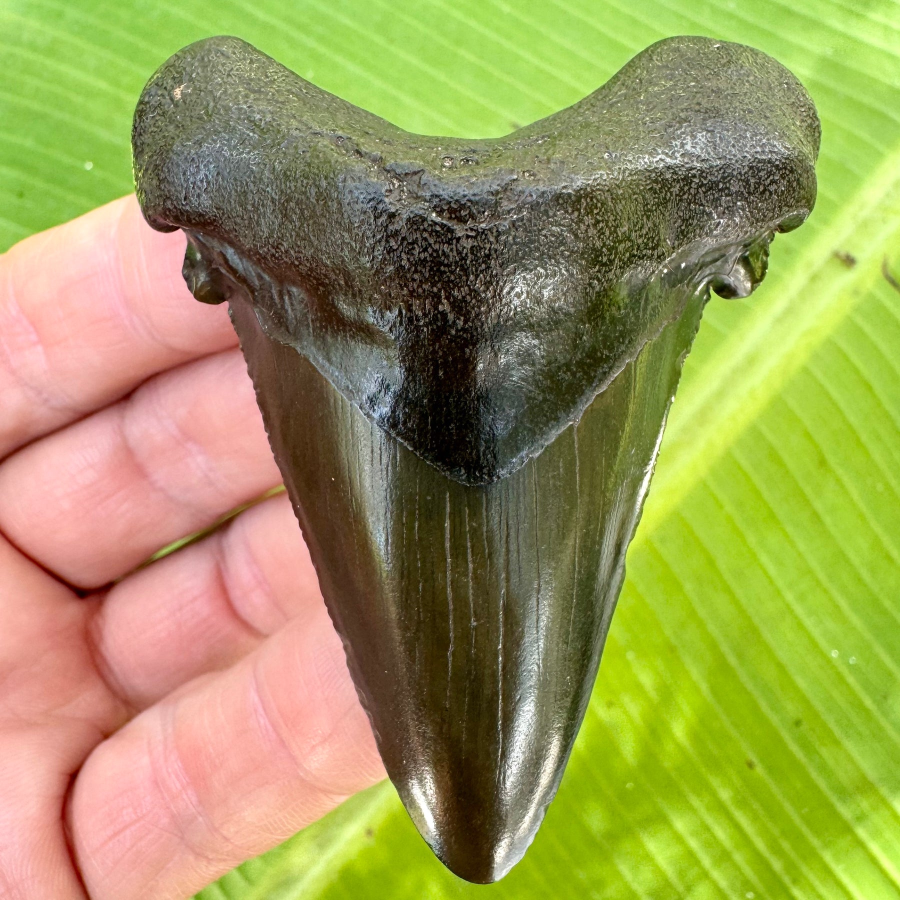 This high quality fossil Auriculatus shark tooth was recovered from the Suwannee river in North Florida. It is a lower anterior jaw position which gives it great symmetry and a robust appearance.