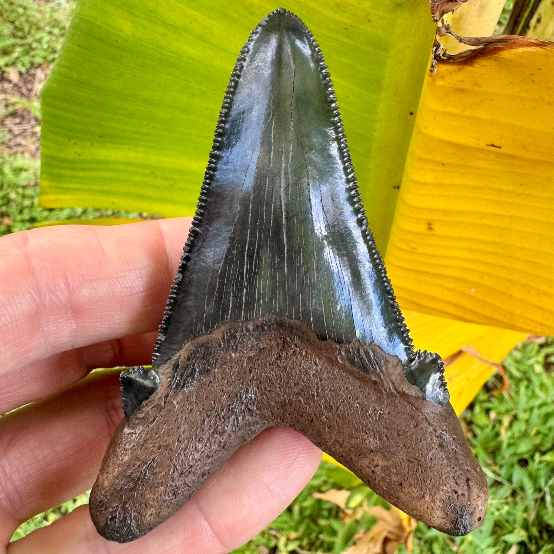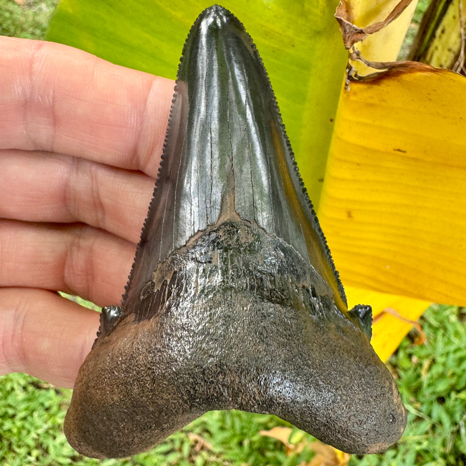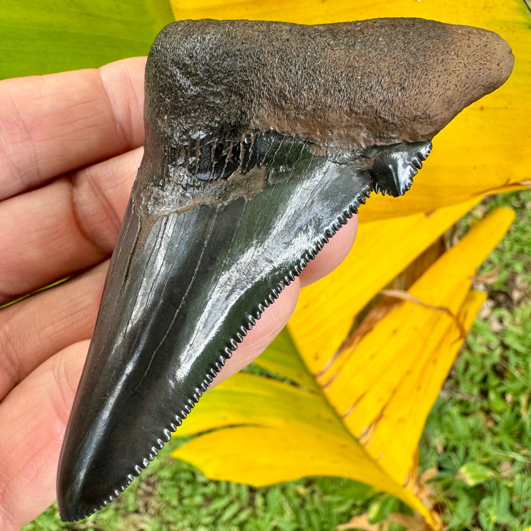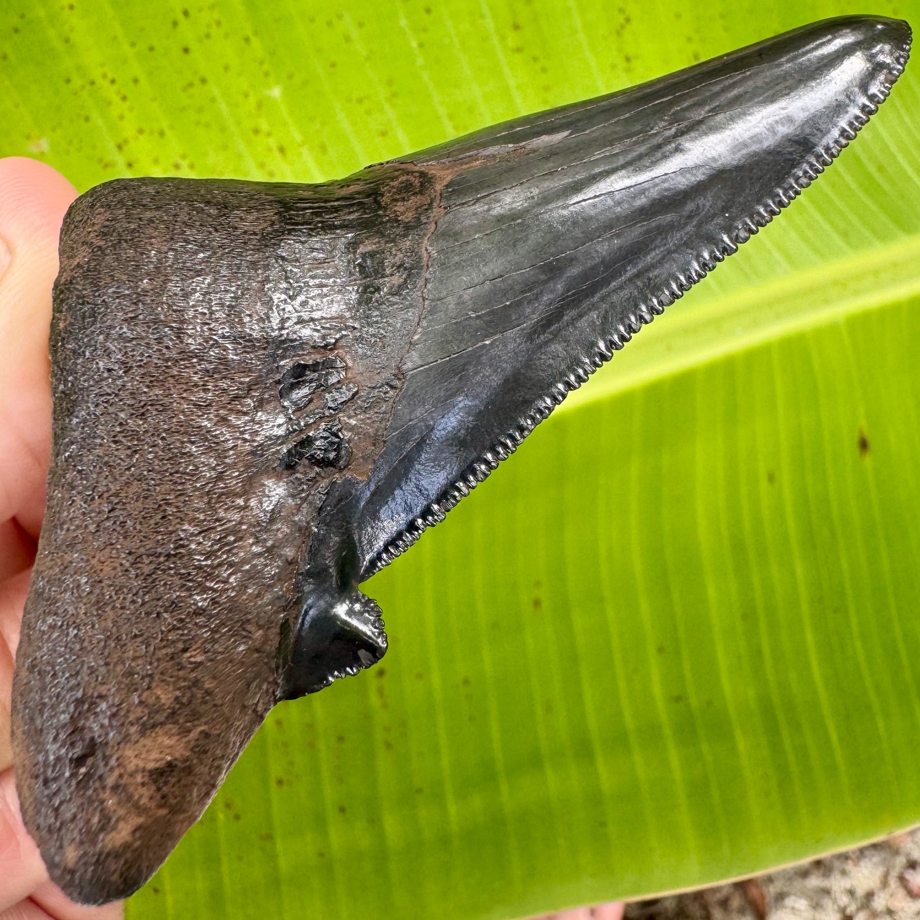 This high quality fossil Auriculatus shark tooth was recovered from the Suwannee river in North Florida. It exhibits glossy black enamel, excellent side cusps, stellar symmetry, a pristine root, razor sharp serrations and a fantastic tip. This is a collector quality 40 million year old specimen.