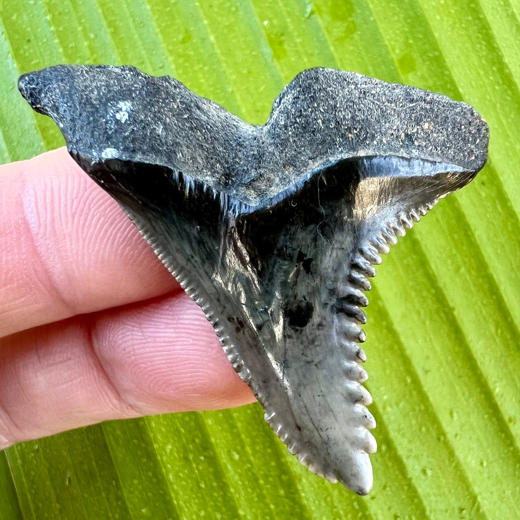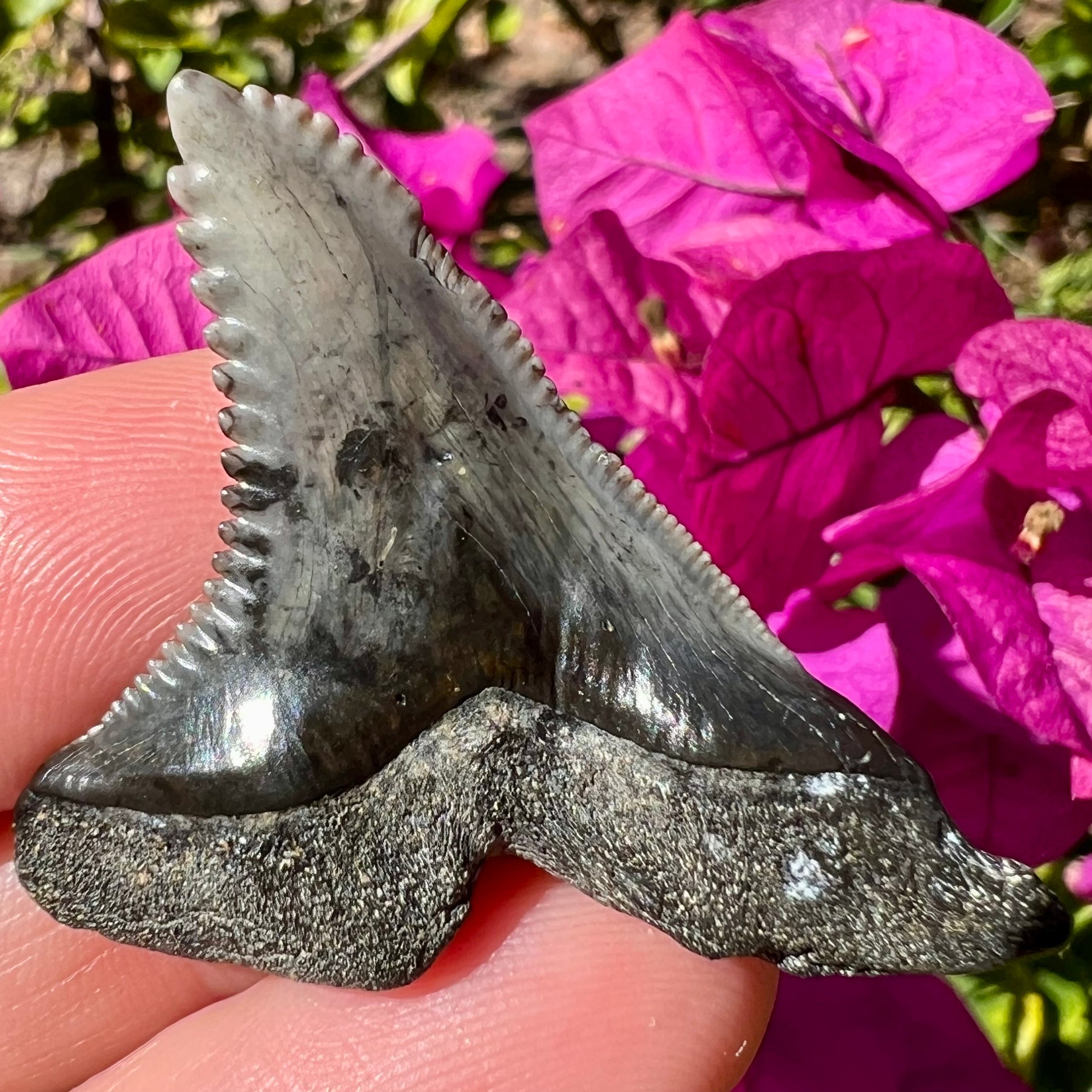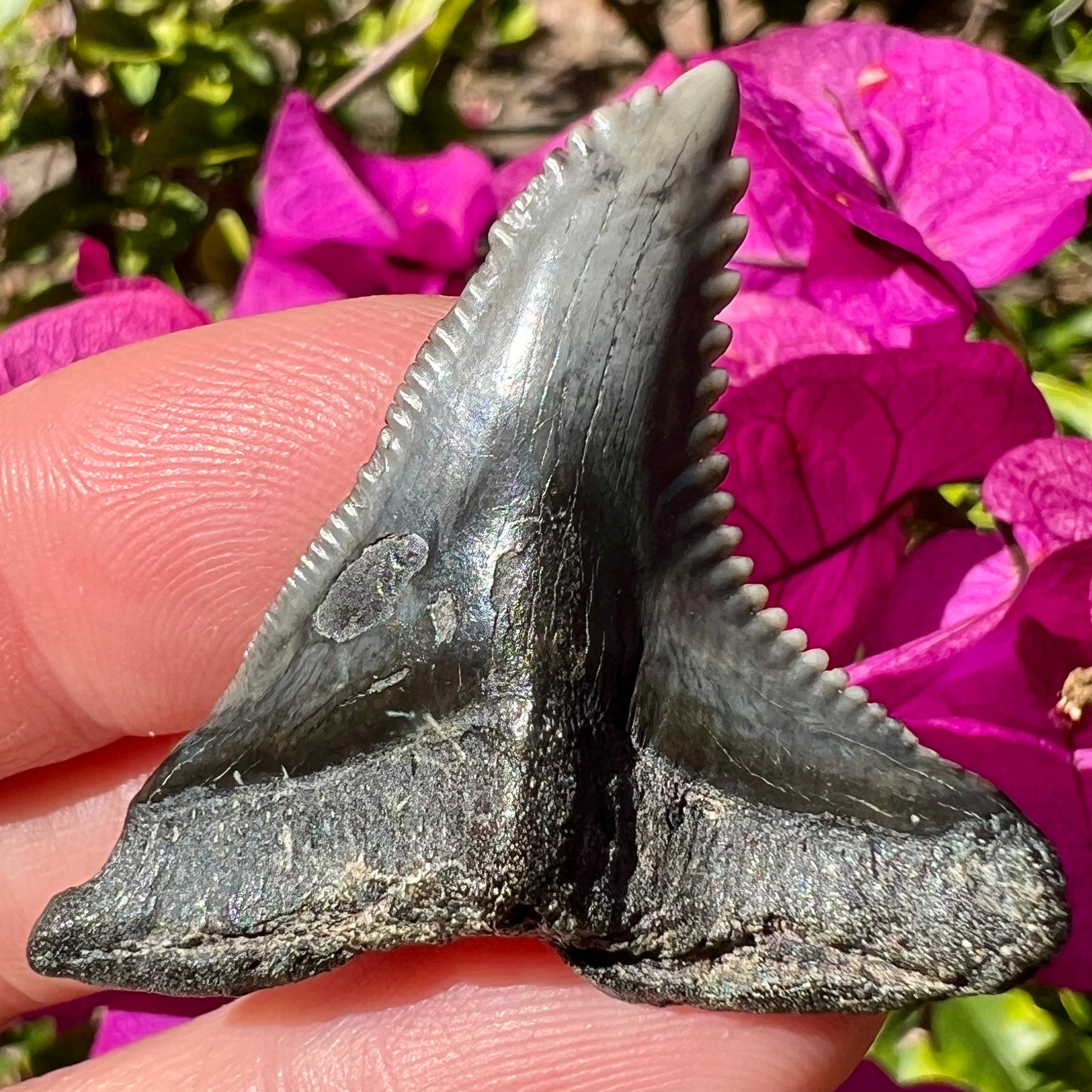 This massive fossil Hemipristis tooth was recovered in Venice, FL. It has crisp serrations, a solid root and attractive lightening patterned enamel.