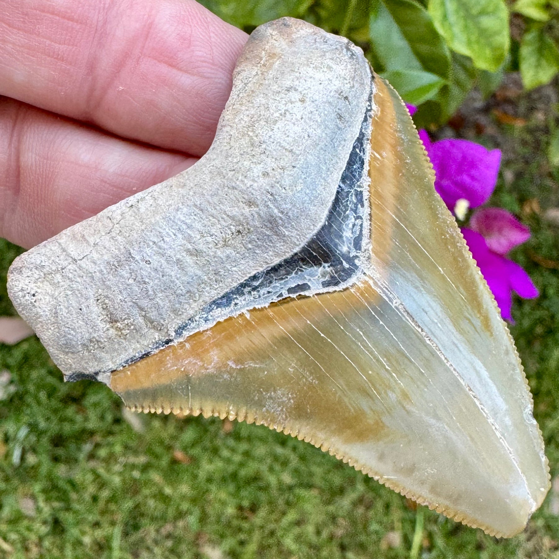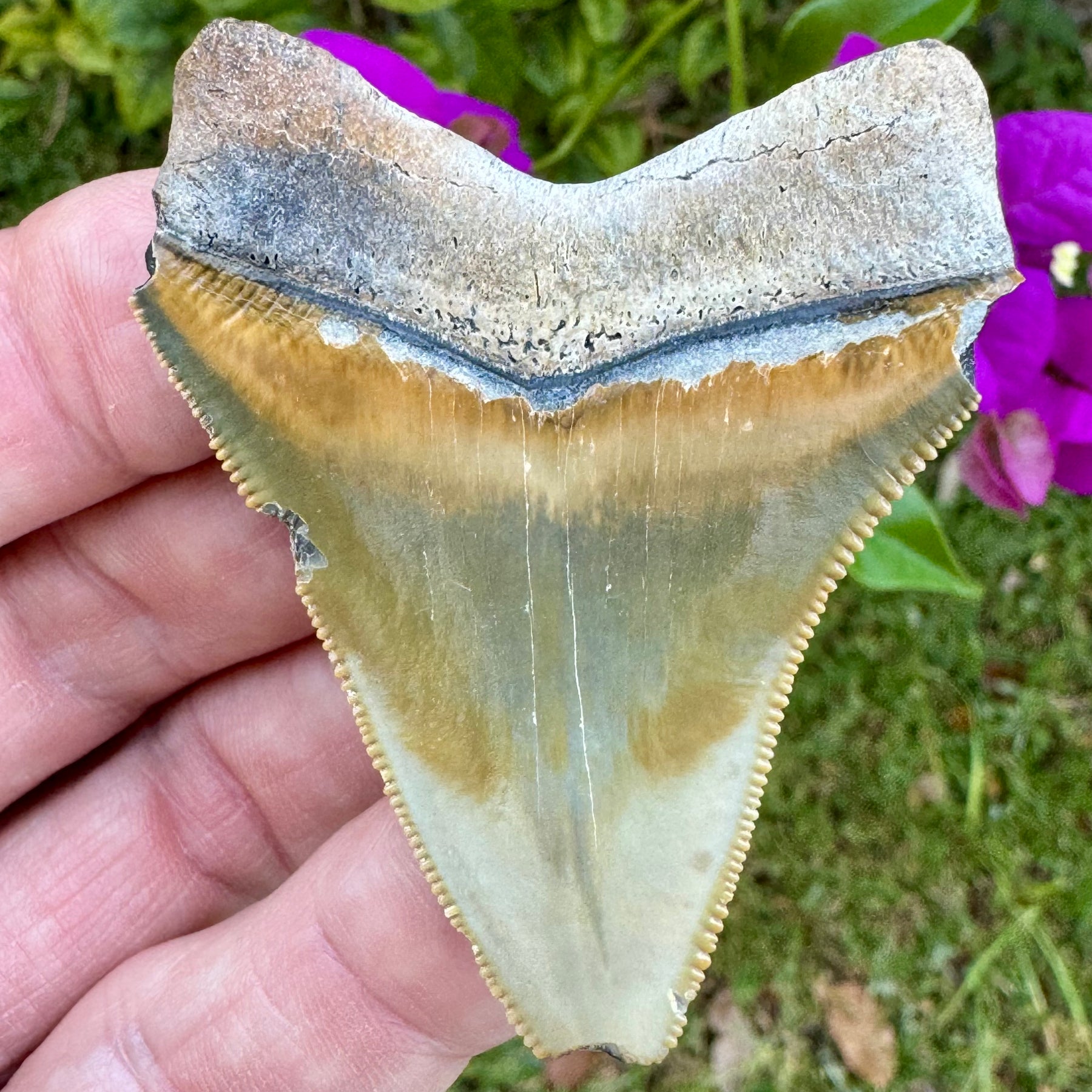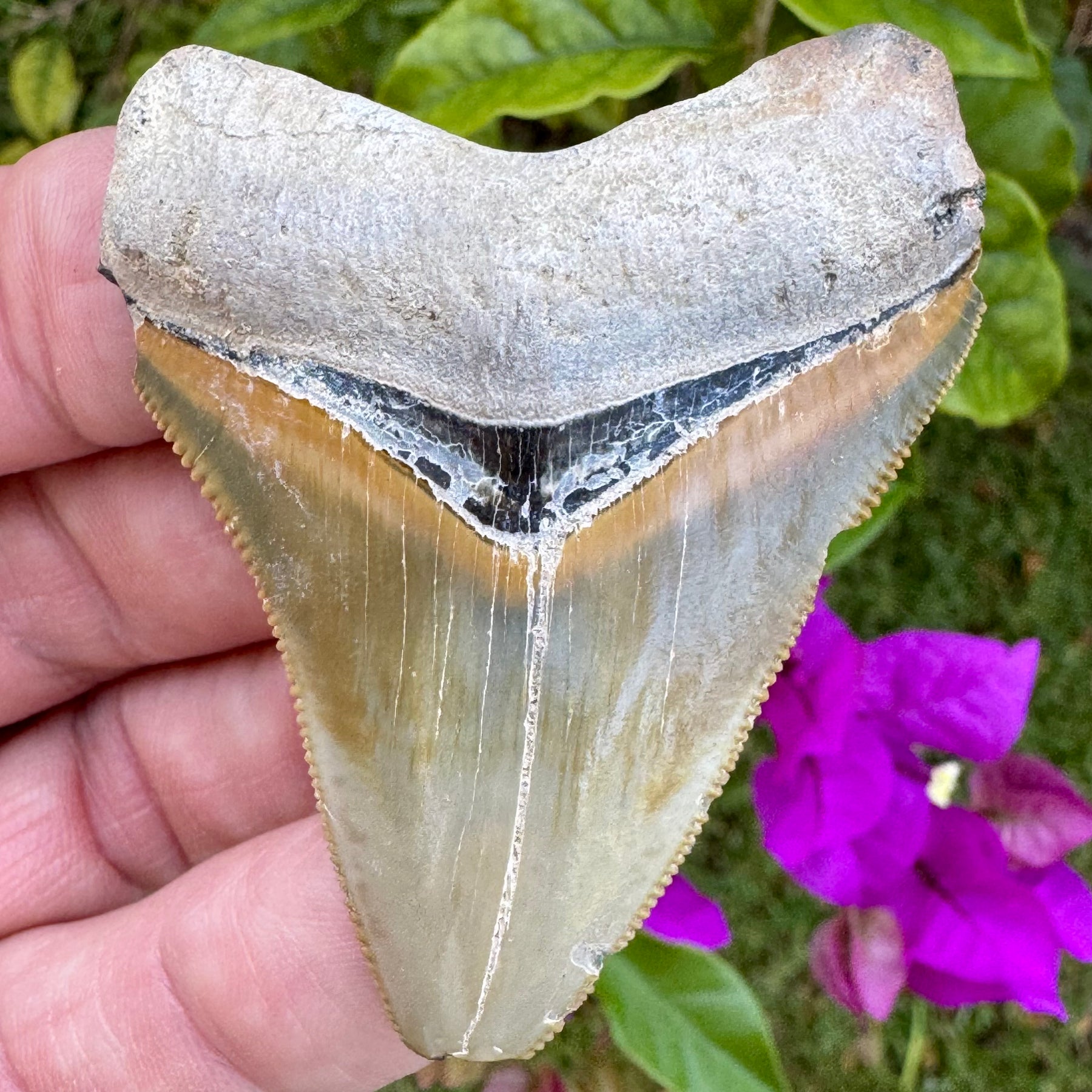This Megalodon shark tooth was recovered from Bone Valley formation in Central Florida. It exhibits spectacular color, razor sharp serrations and a solid detailed root.