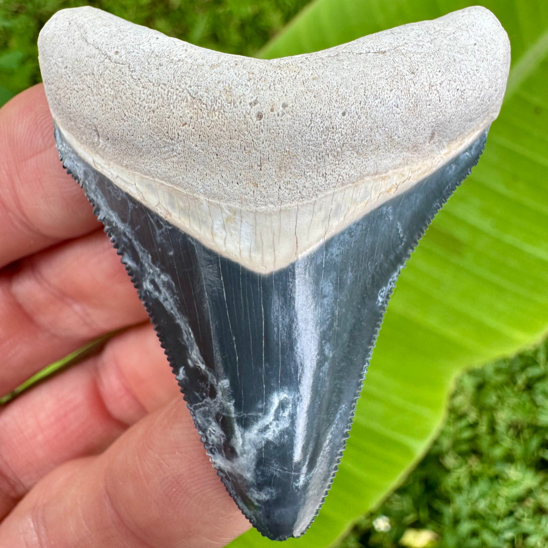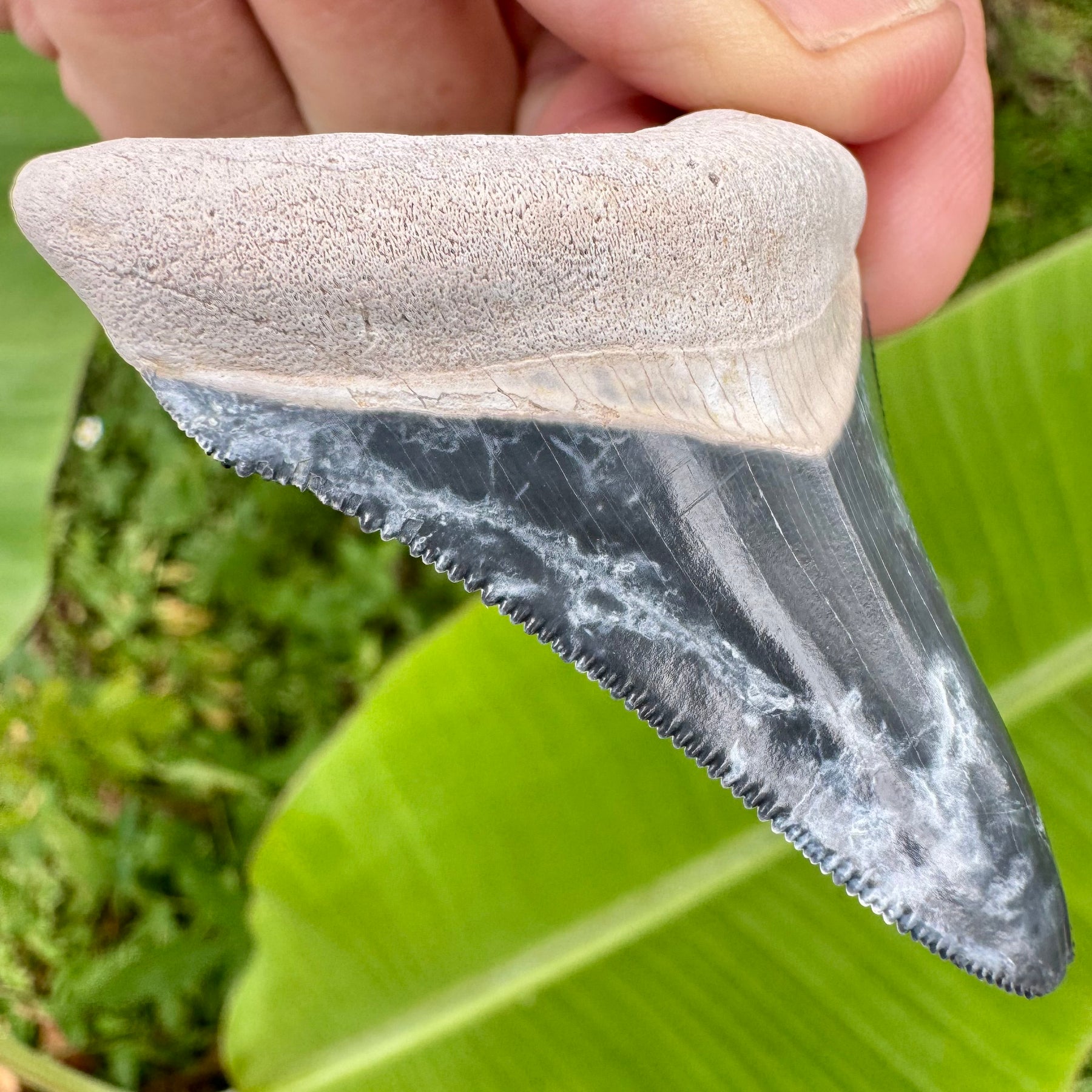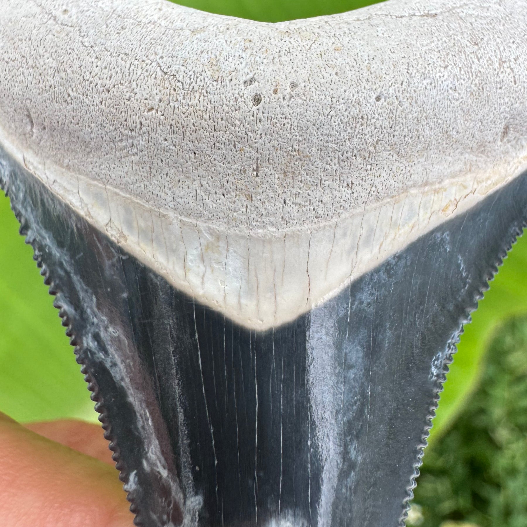 This Megalodon shark tooth was recovered from Bone Valley formation in Central Florida. This tooth has an incredible white root, a top quality bourlette and glossy patterned enamel.