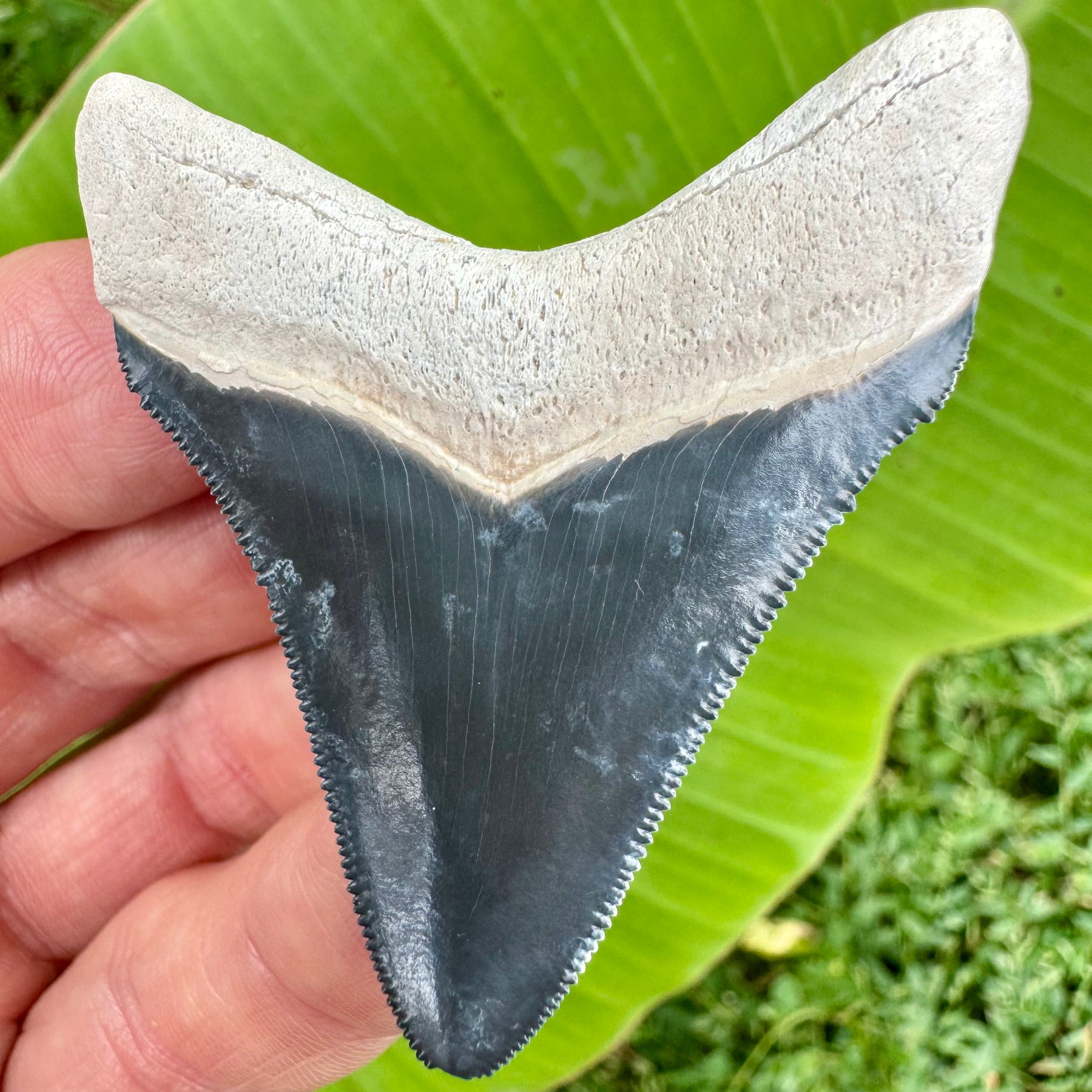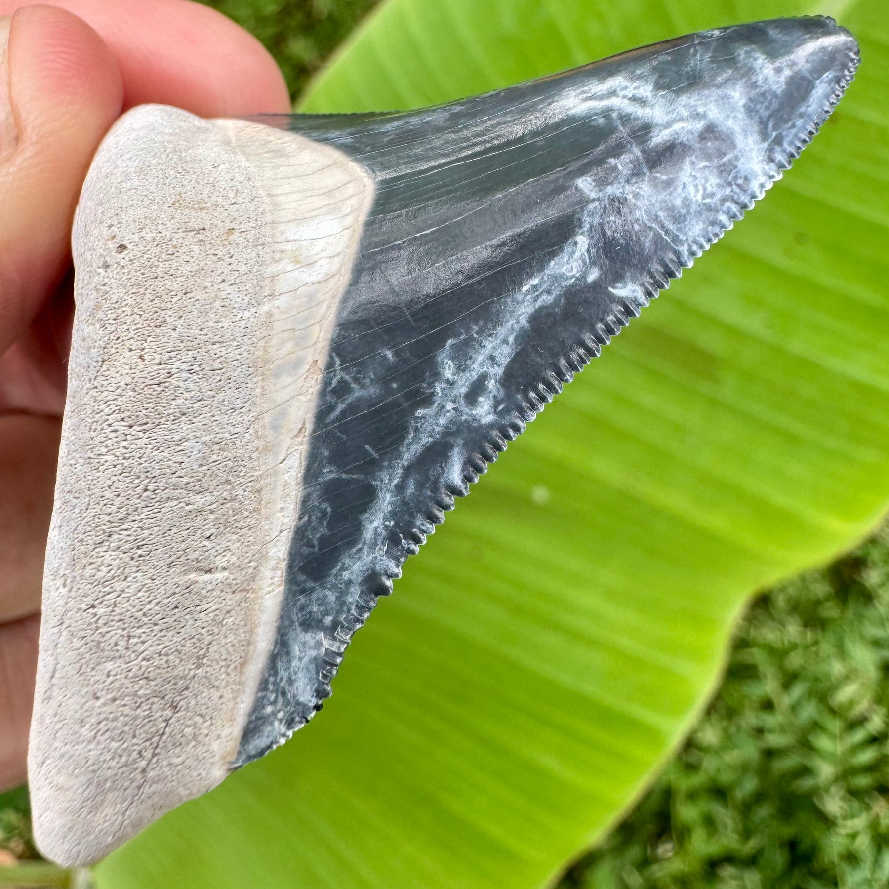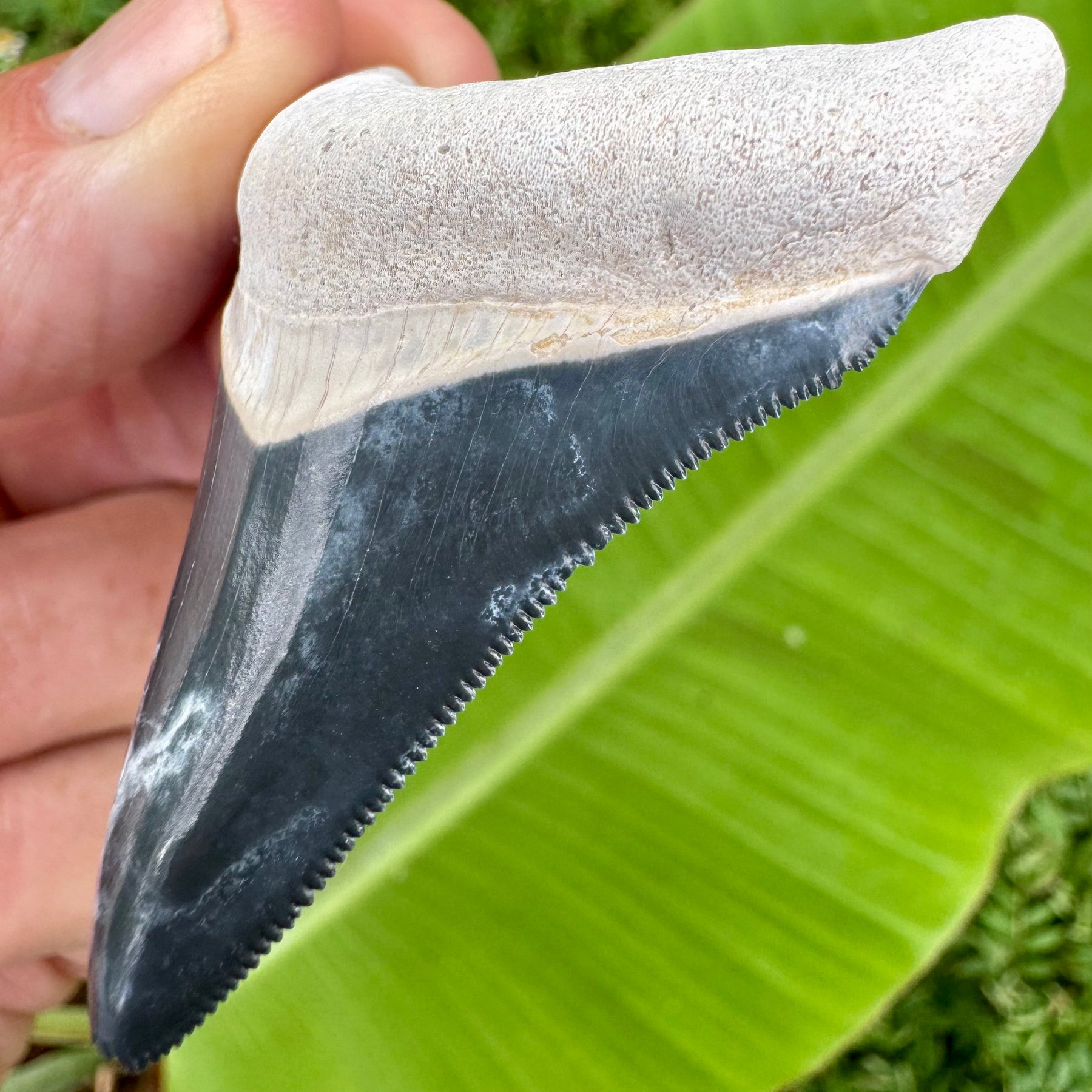 This Megalodon shark tooth was recovered from Bone Valley formation in Central Florida. This tooth has an incredible white root, a top quality bourlette and glossy patterned enamel.