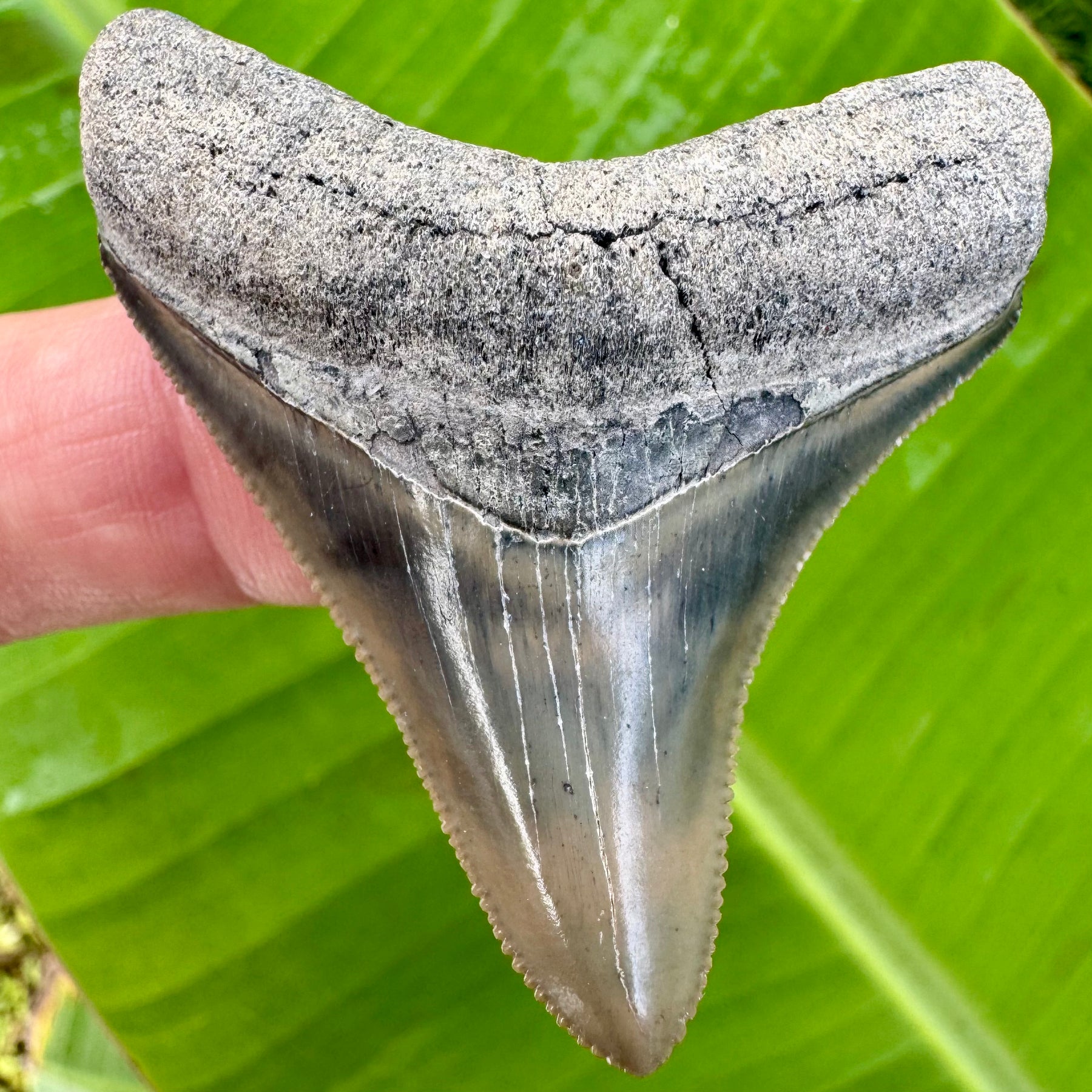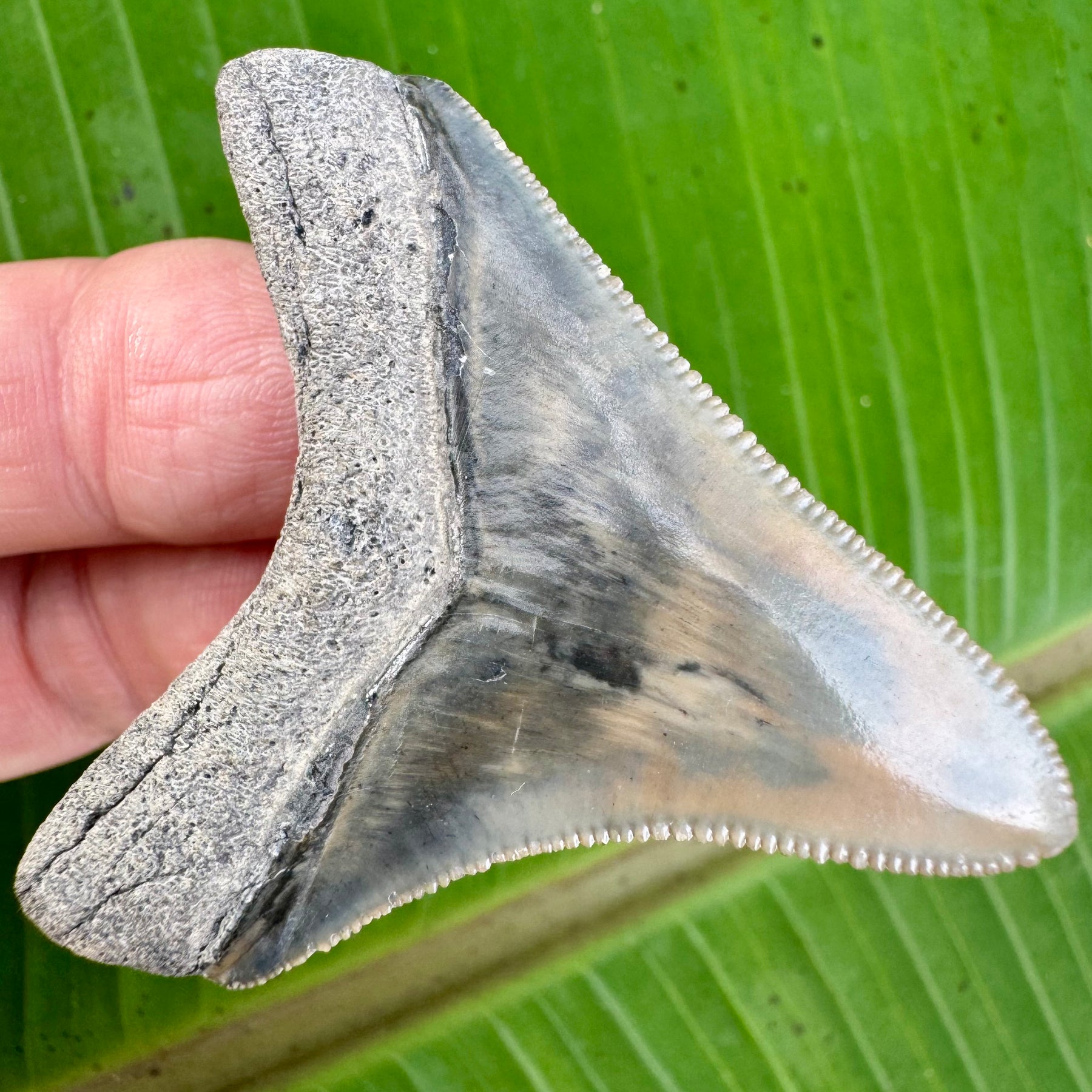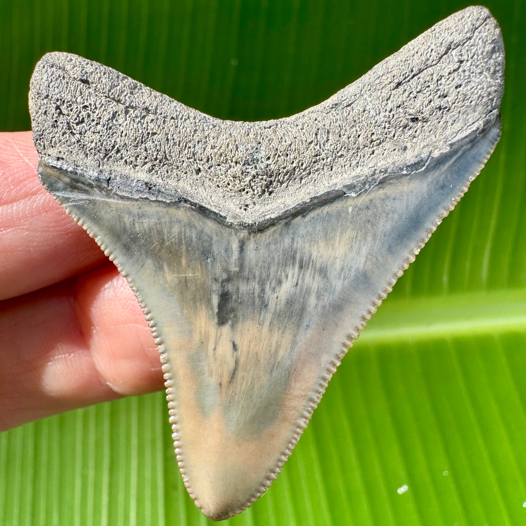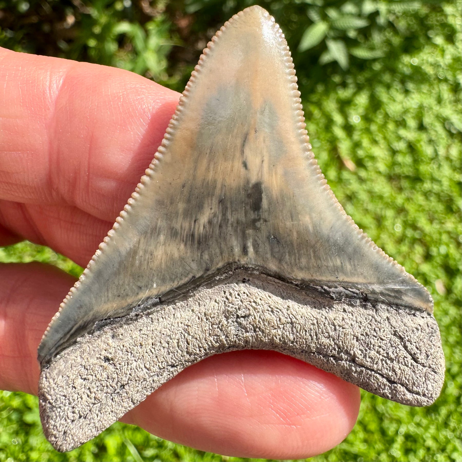 This Megalodon shark tooth was recovered from Bone Valley formation in Central Florida. It exhibits excellent coloration in the blade, an intact tip, razor sharp serrations and an outstanding root.