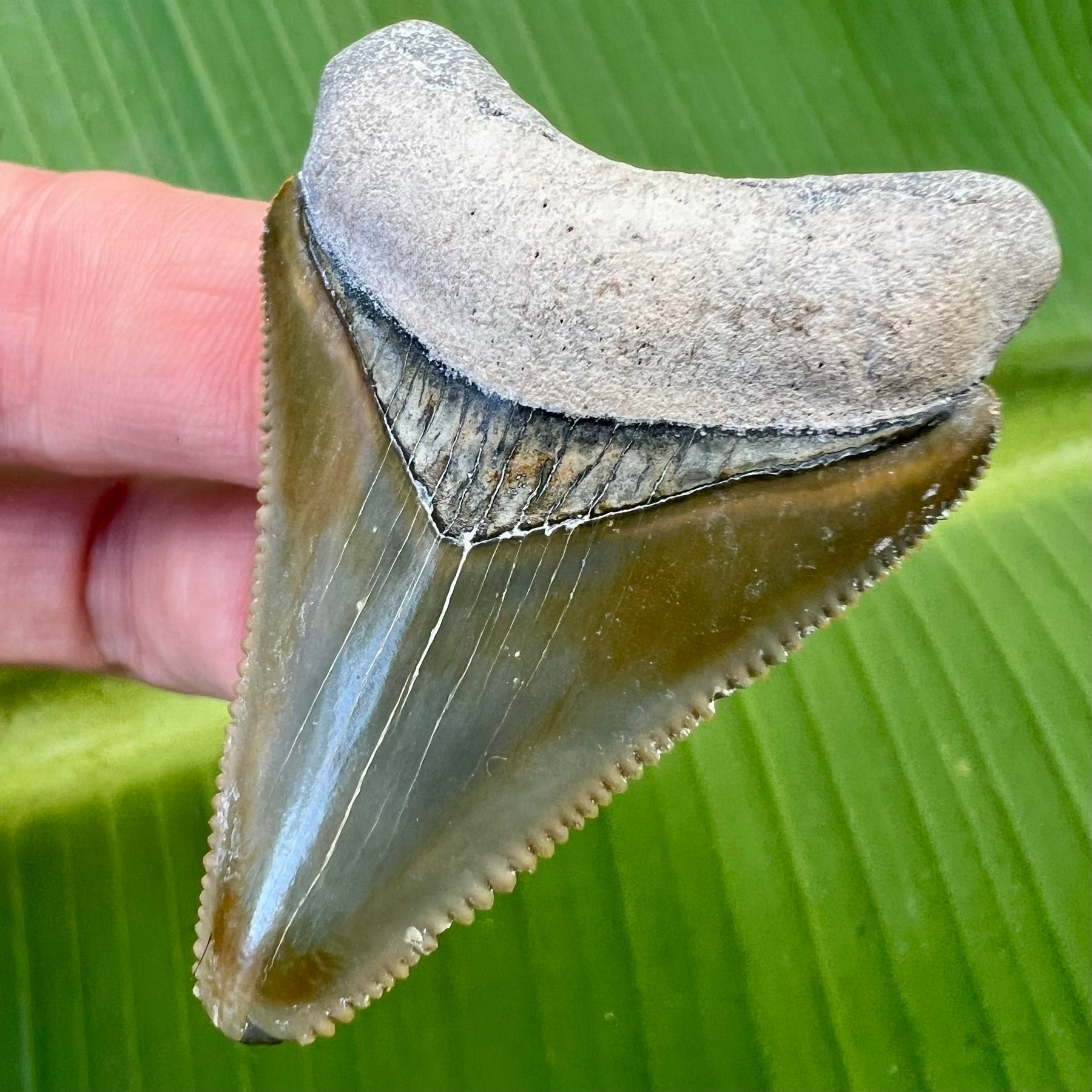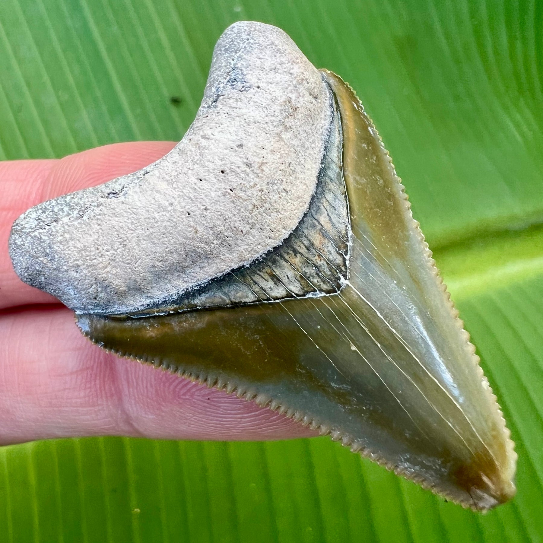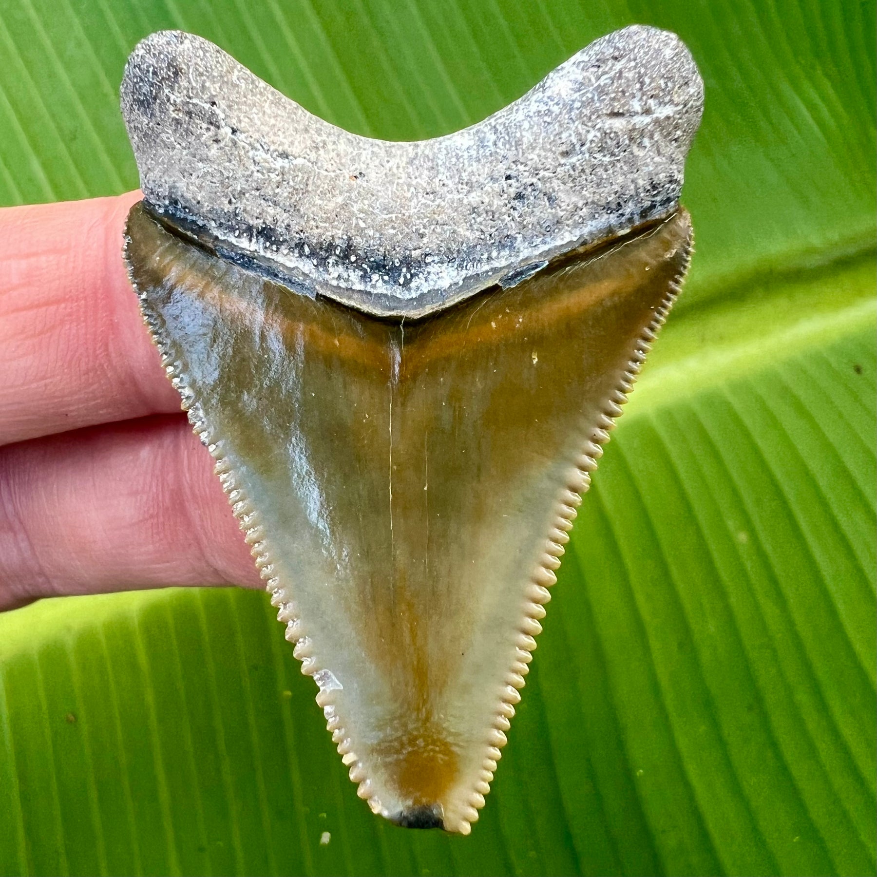 This Megalodon shark tooth was recovered from Bone Valley formation in Central Florida. It has a beautiful bourlette, a solid root and sharp serrations.
