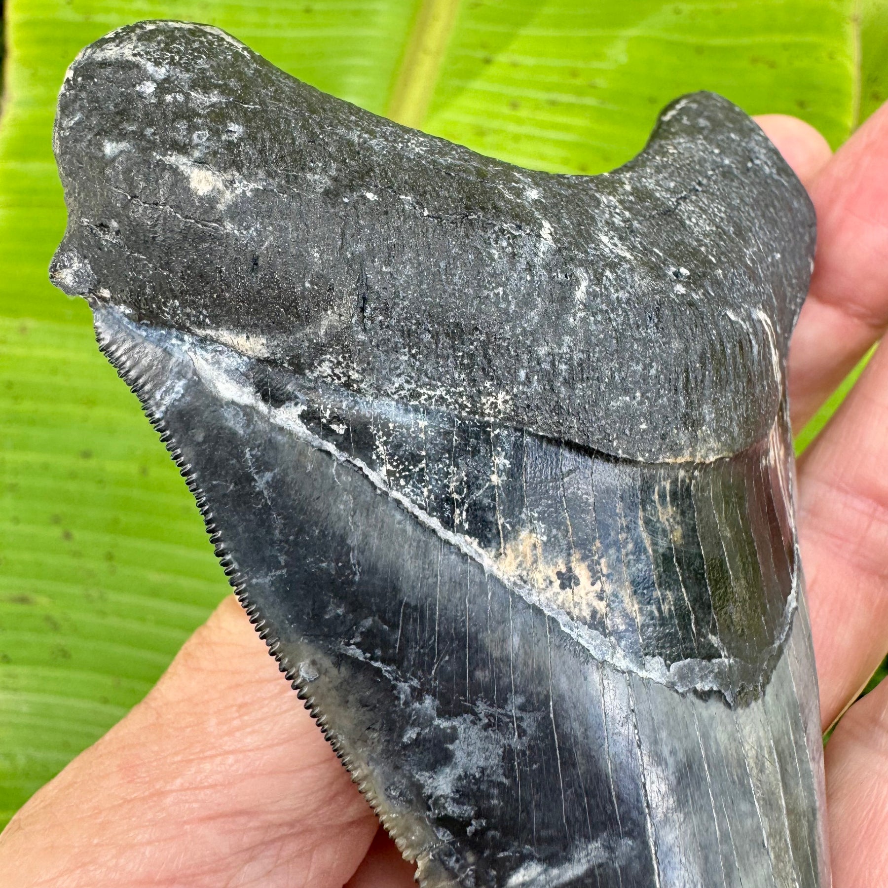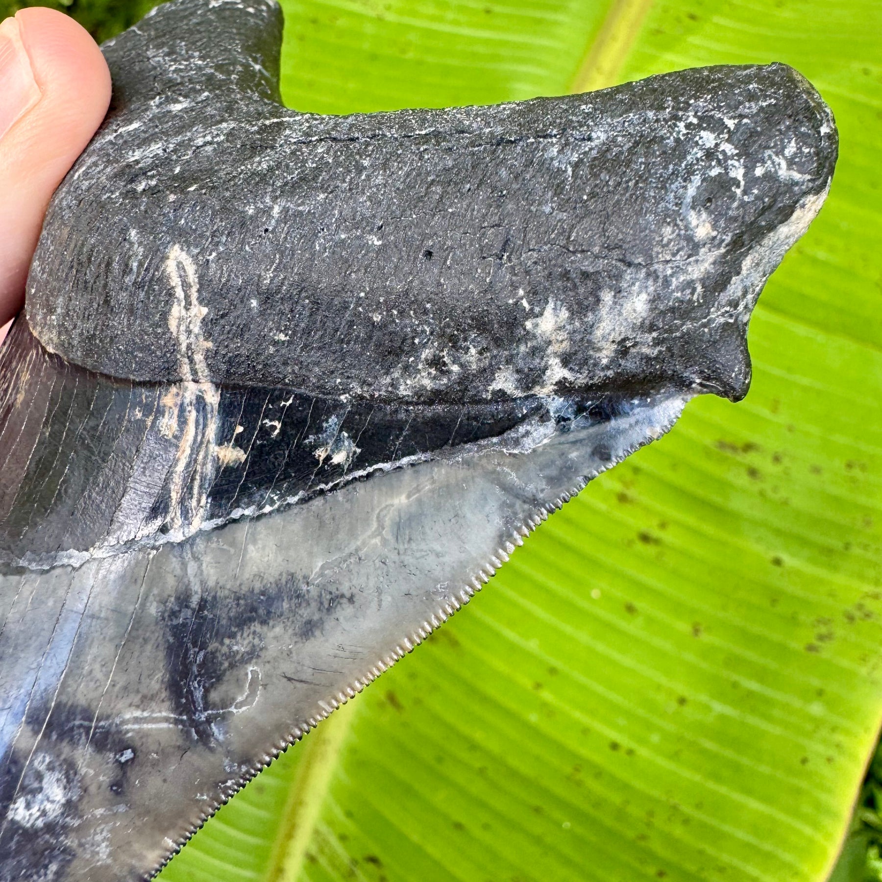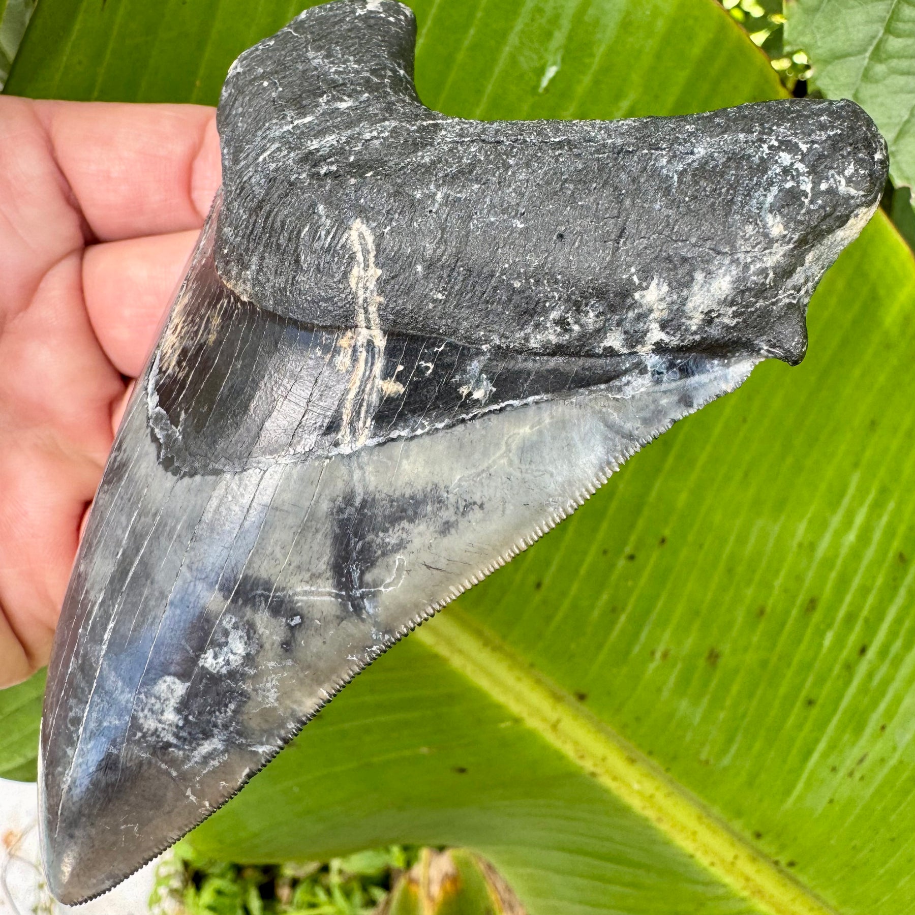 This fossil Megalodon shark tooth was recovered in Central Florida. It exhibits wonderful marbled enamel, razor sharp serrations, an outstanding bourlette, a fantastic root and a glossy blade.