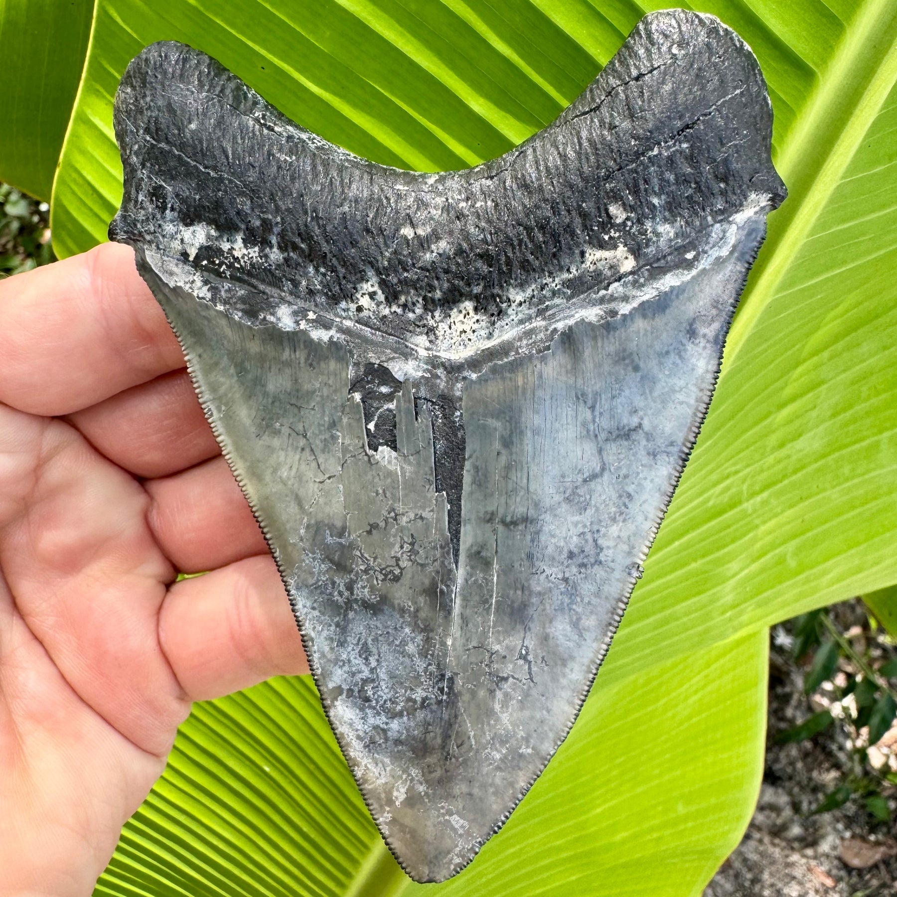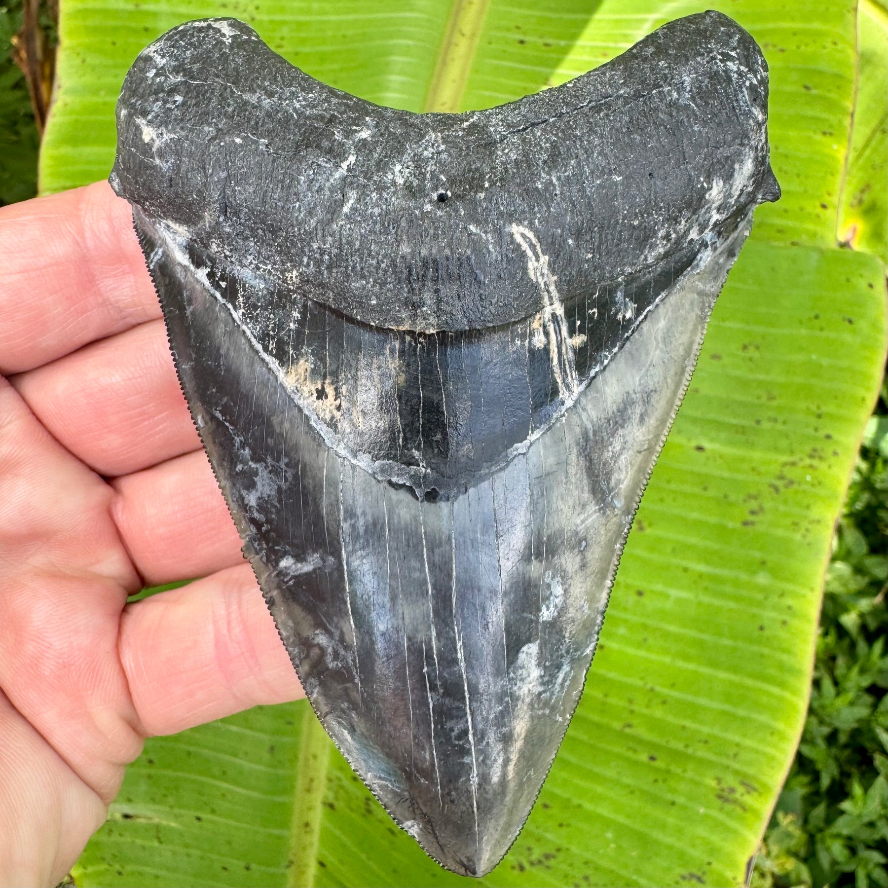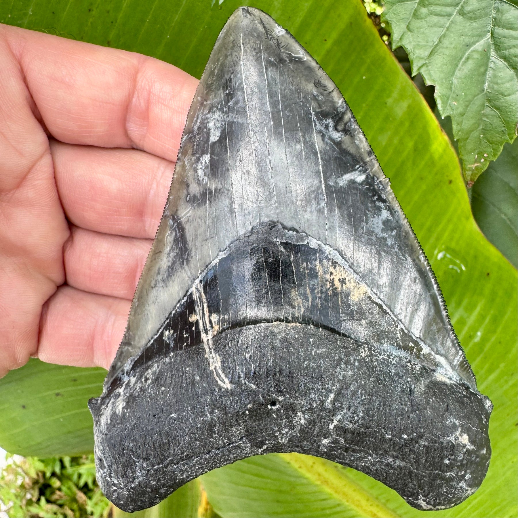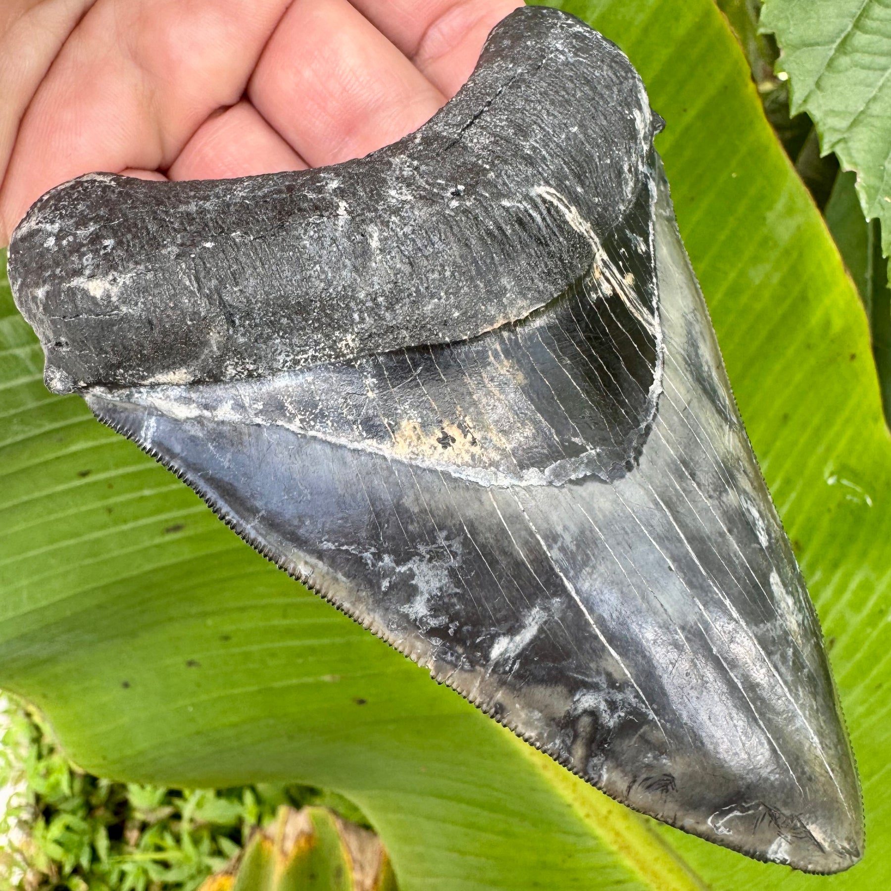 This fossil Megalodon shark tooth was recovered in Central Florida. It exhibits wonderful marbled enamel, razor sharp serrations, an outstanding bourlette, a fantastic root and a glossy blade.