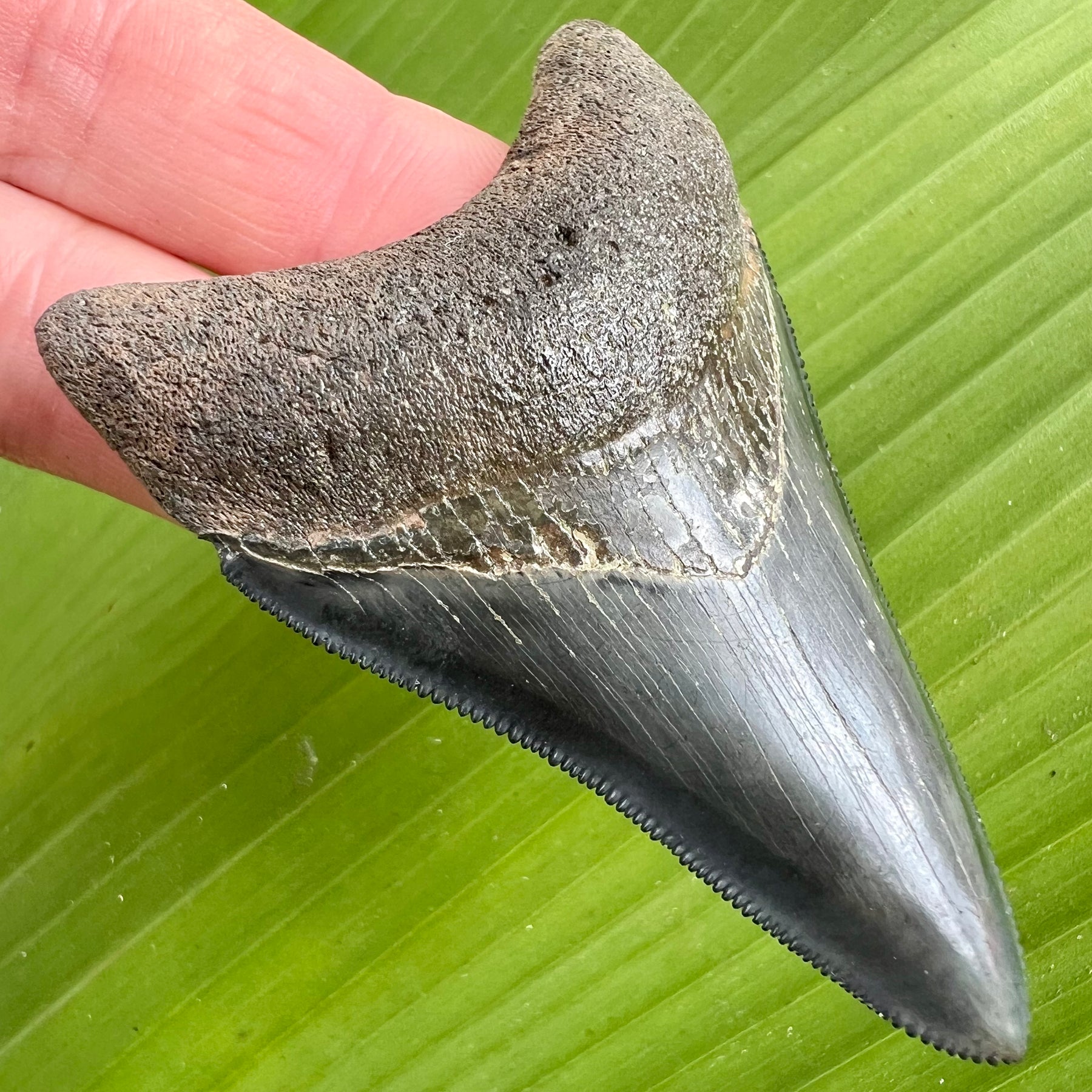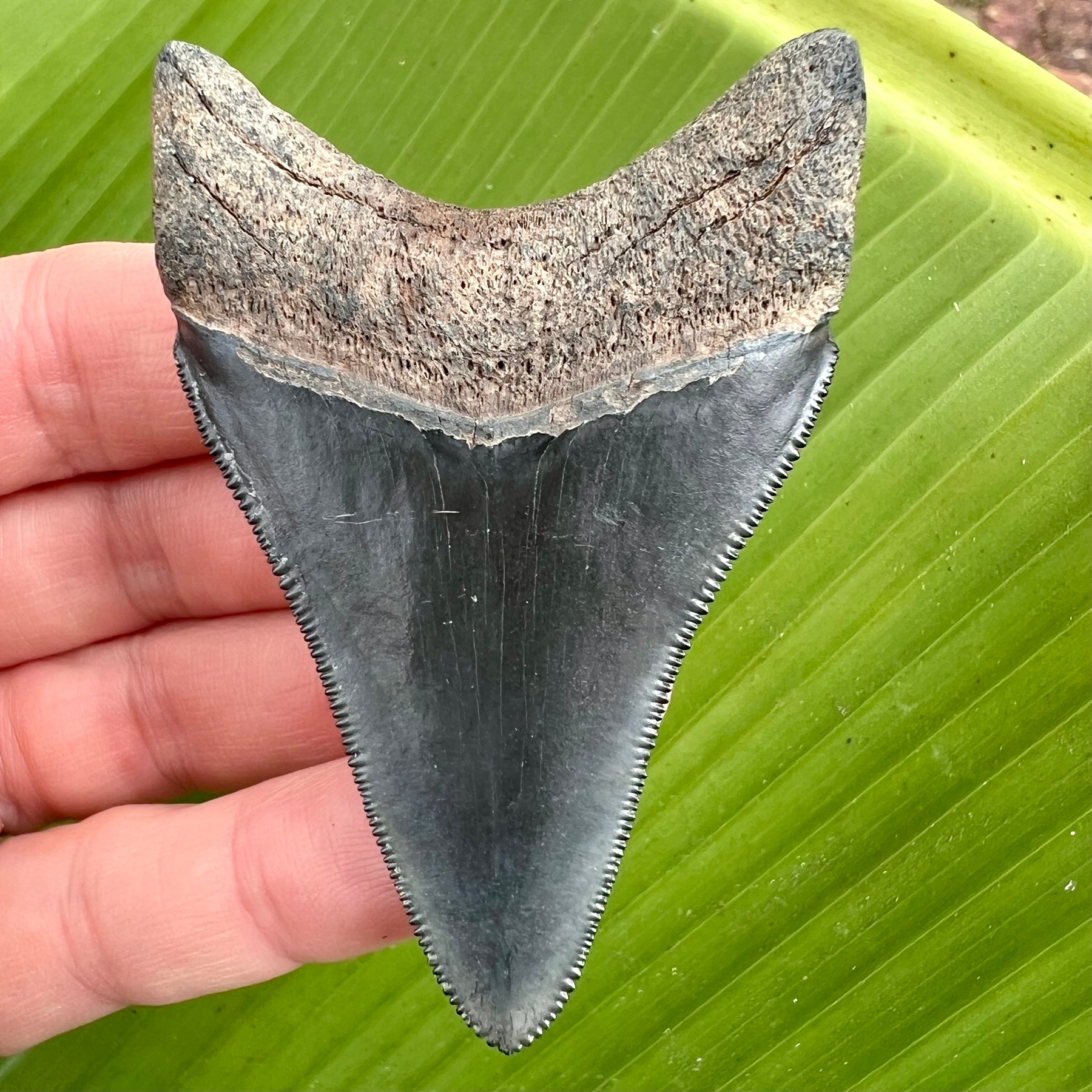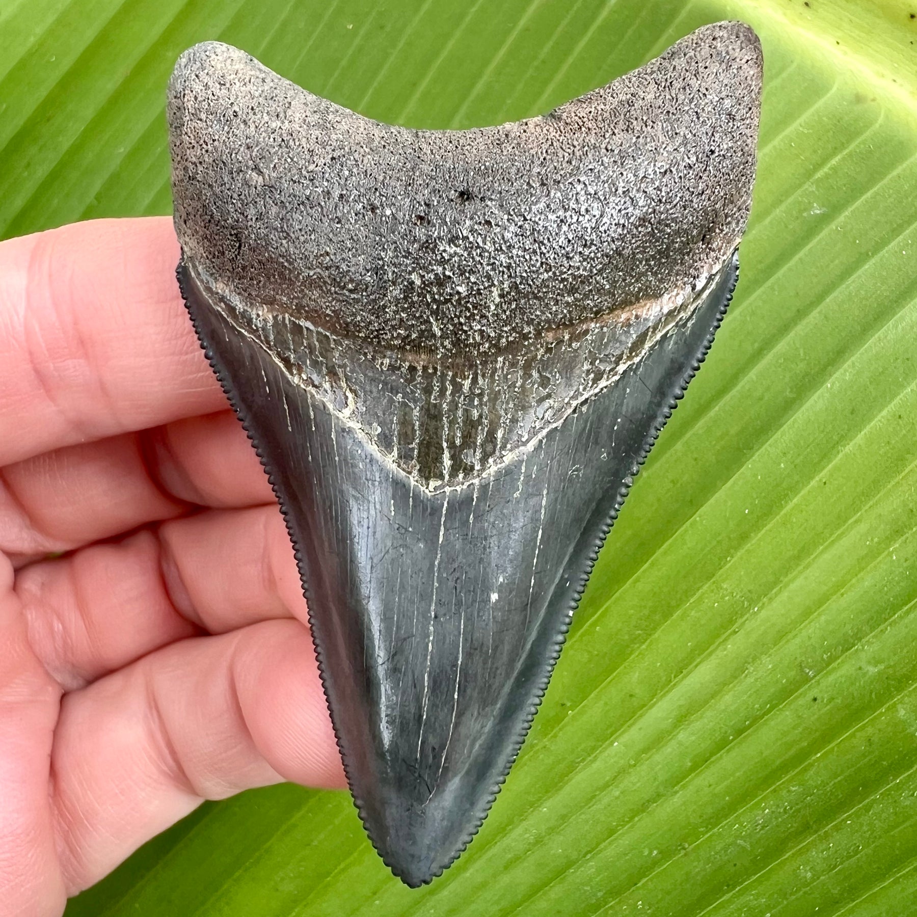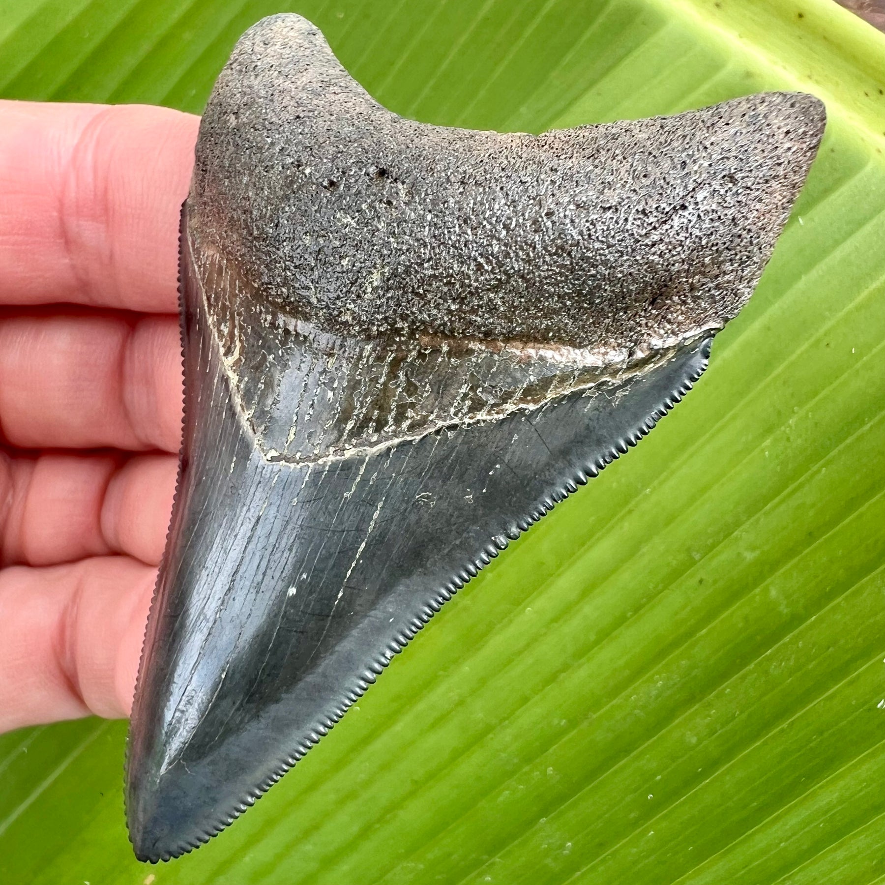 This exceptional Megalodon shark tooth was recovered from the Peace River in Florida. It has intact razor sharp serrations, glossy enamel, excellent symmetry, a pristine tip, a solid root and an attractive bourlette.